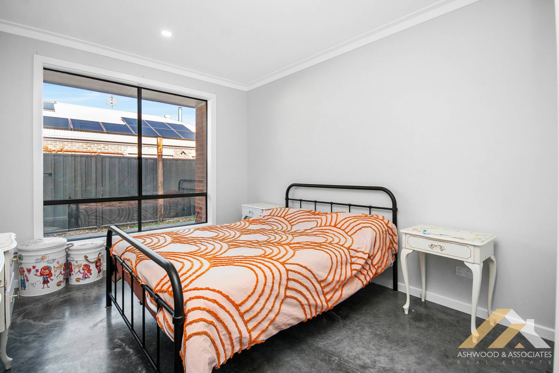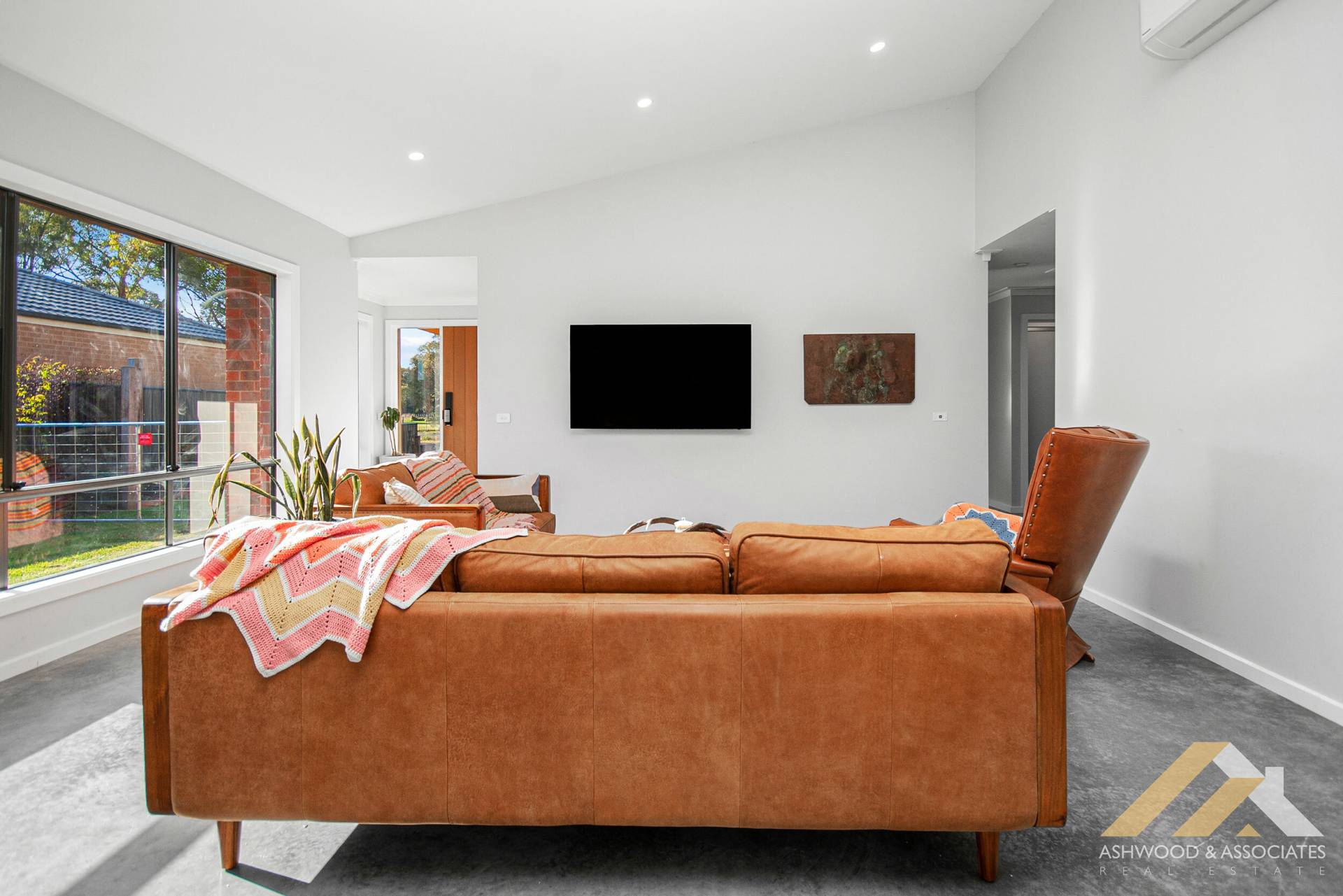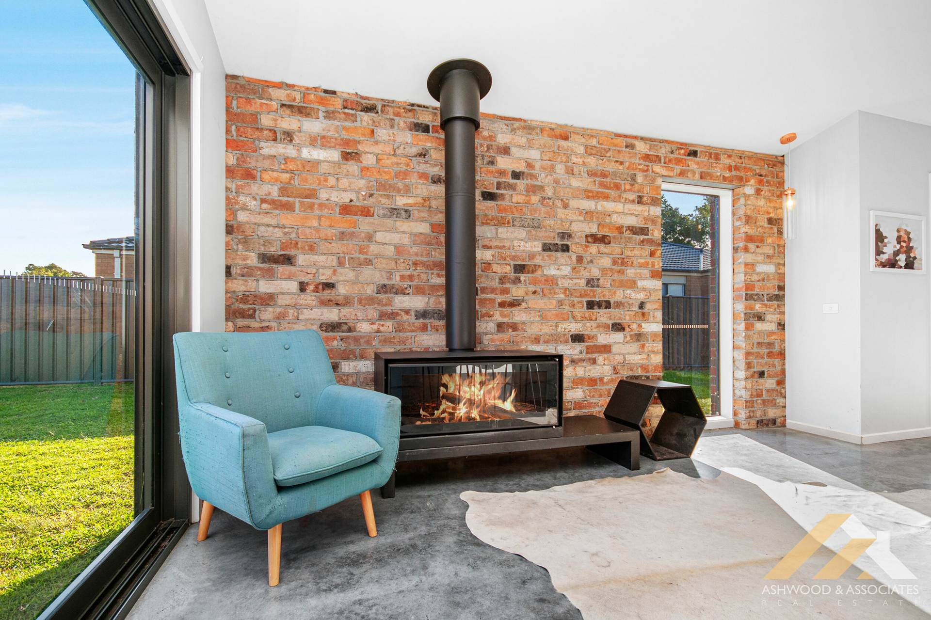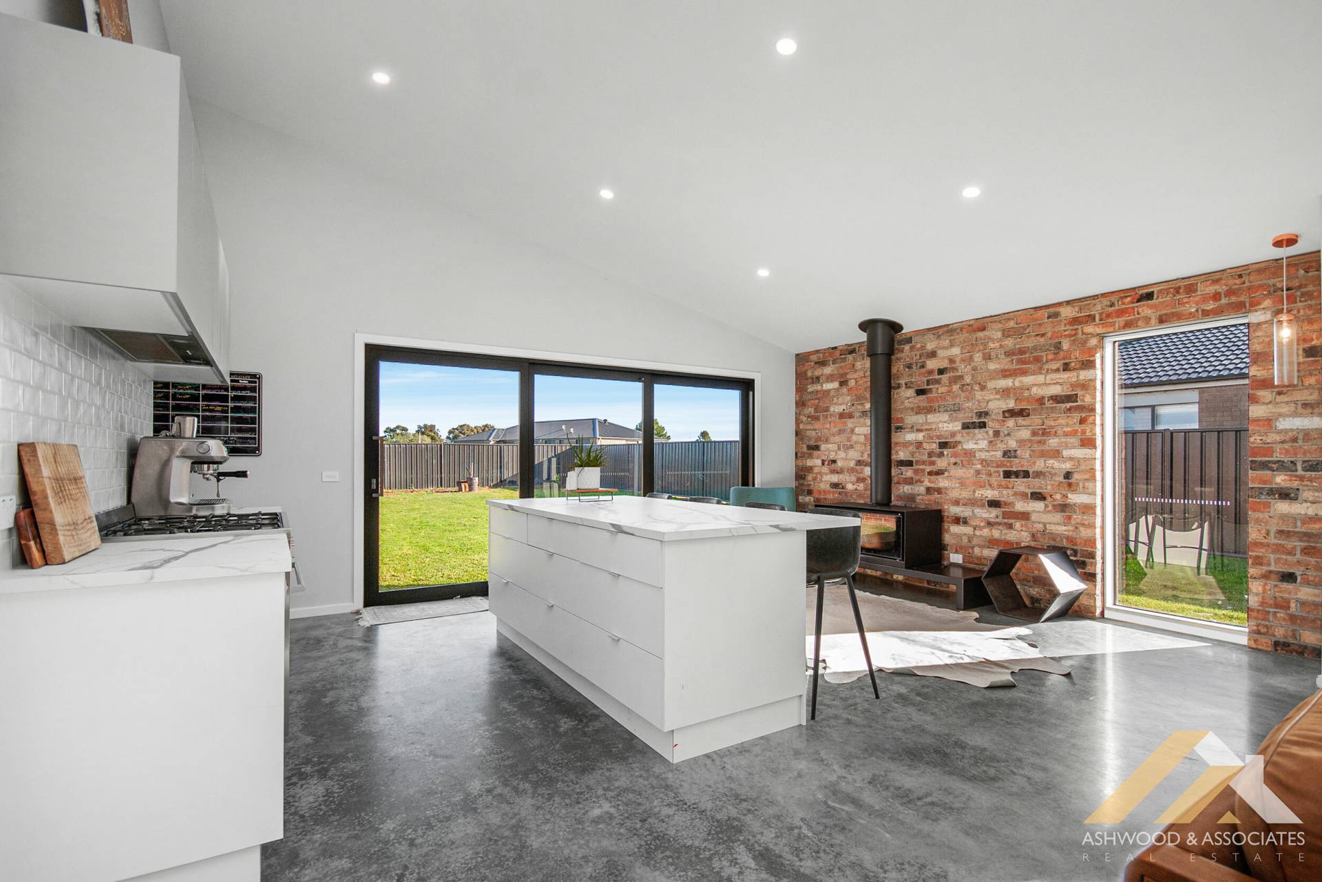 Polished concrete floors span the entire residence, adding a touch of contemporary elegance to every room, complete with split system heating/cooling ensuring year-round comfort. The designer wood fire crackles warmly in the living room, creating a cosy ambience perfect for gathering with loved ones on chilly evenings.
