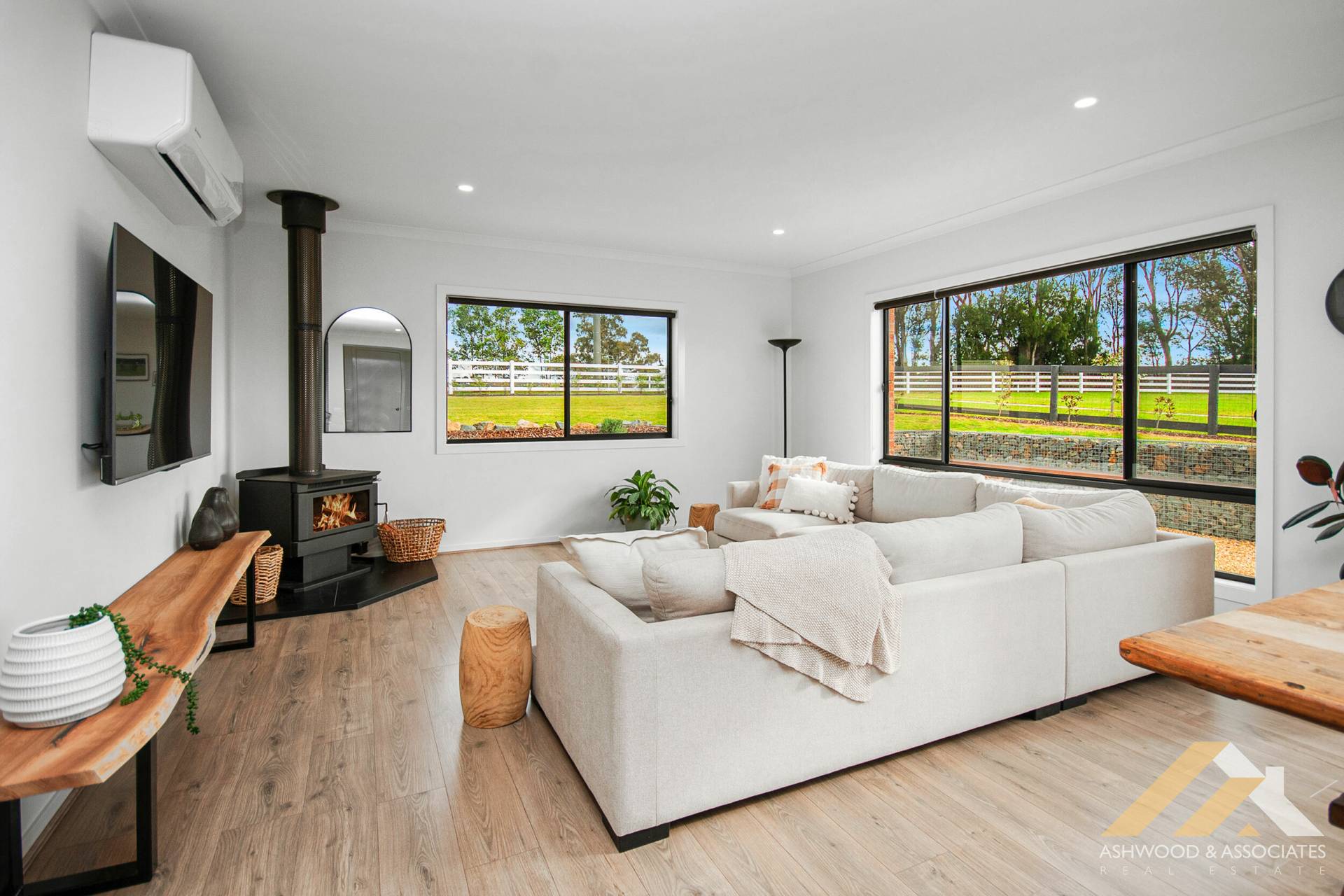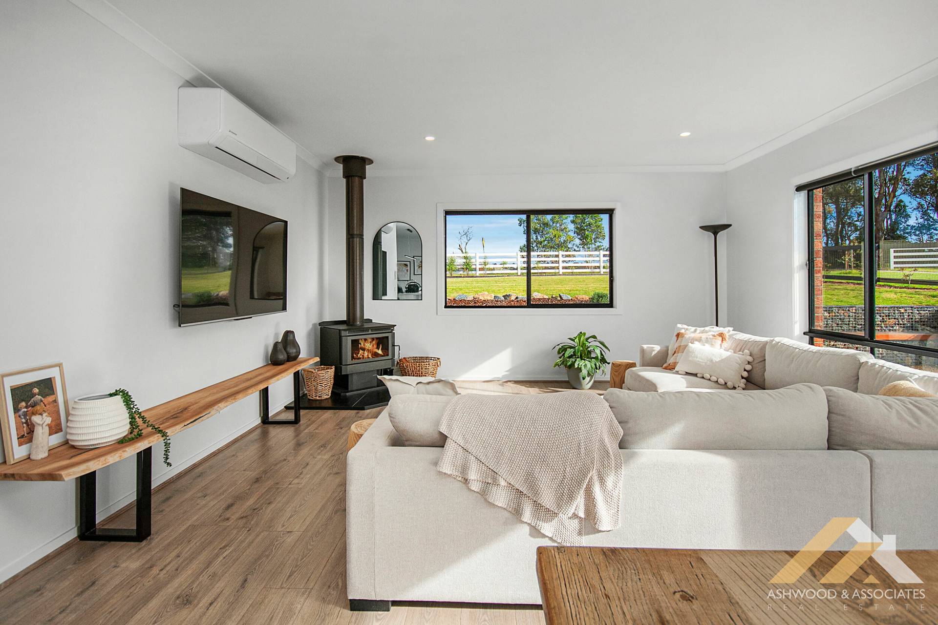 With a unique layout and being only 1.5 years old, this home still benefits from the remaining Builder's Warranty, providing peace of mind. As you step inside, you'll be greeted by a light-filled, north-facing living room, complemented by a cosy wood fire, perfect for creating a warm and inviting ambiance.