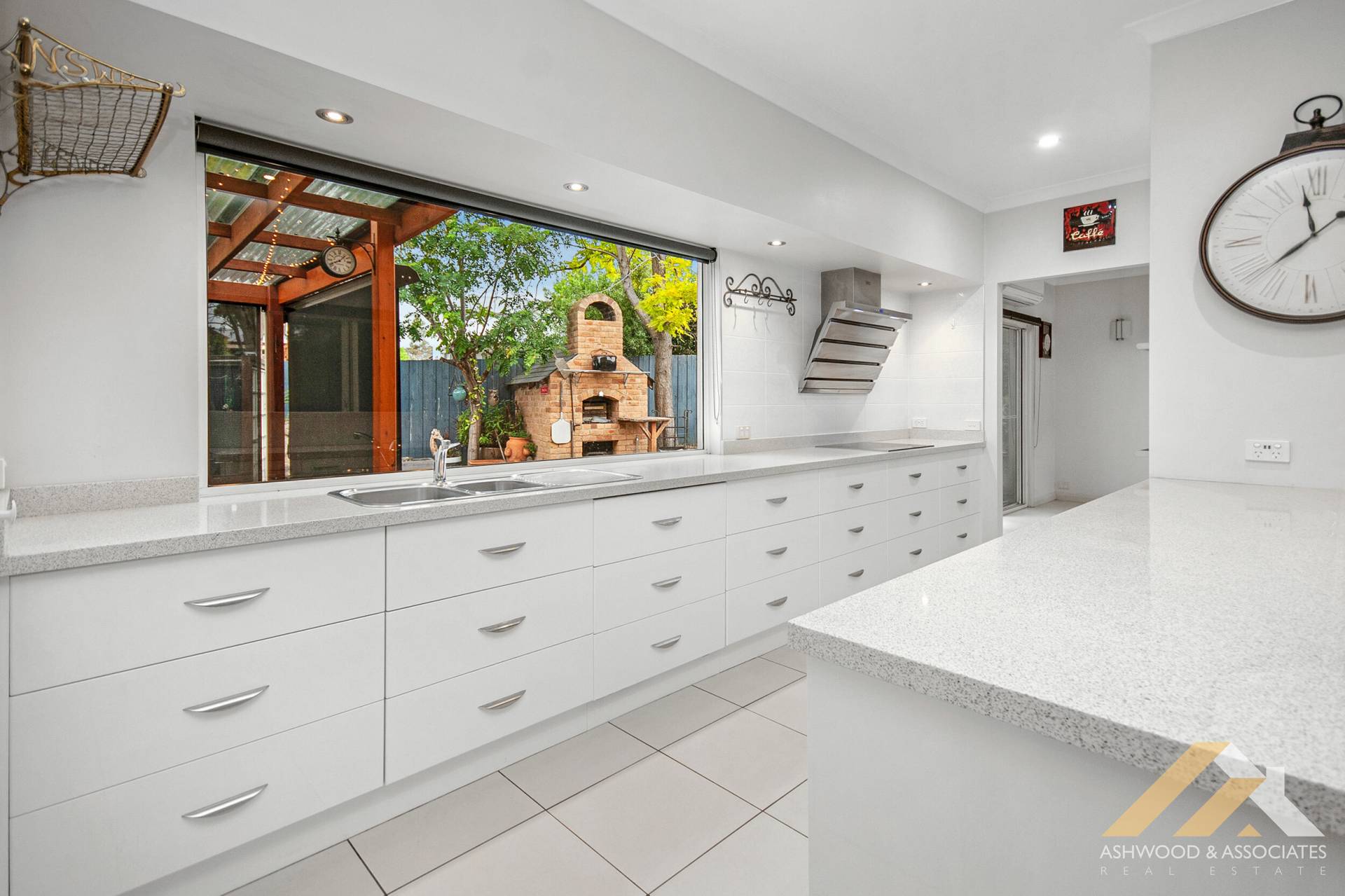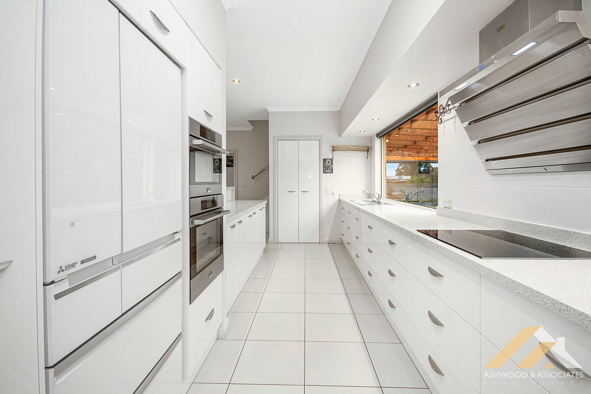 Step inside to find a spacious, modern, and thoughtfully designed home, comprising three bedrooms plus a study, 2.5 bathrooms, and ample living and entertaining spaces. The contemporary kitchen features sprawling stone benches, quality appliances, an integrated dishwasher, and an induction cooktop. A large picture window serves as the kitchen splashback, flooding the area with an abundance of natural light.