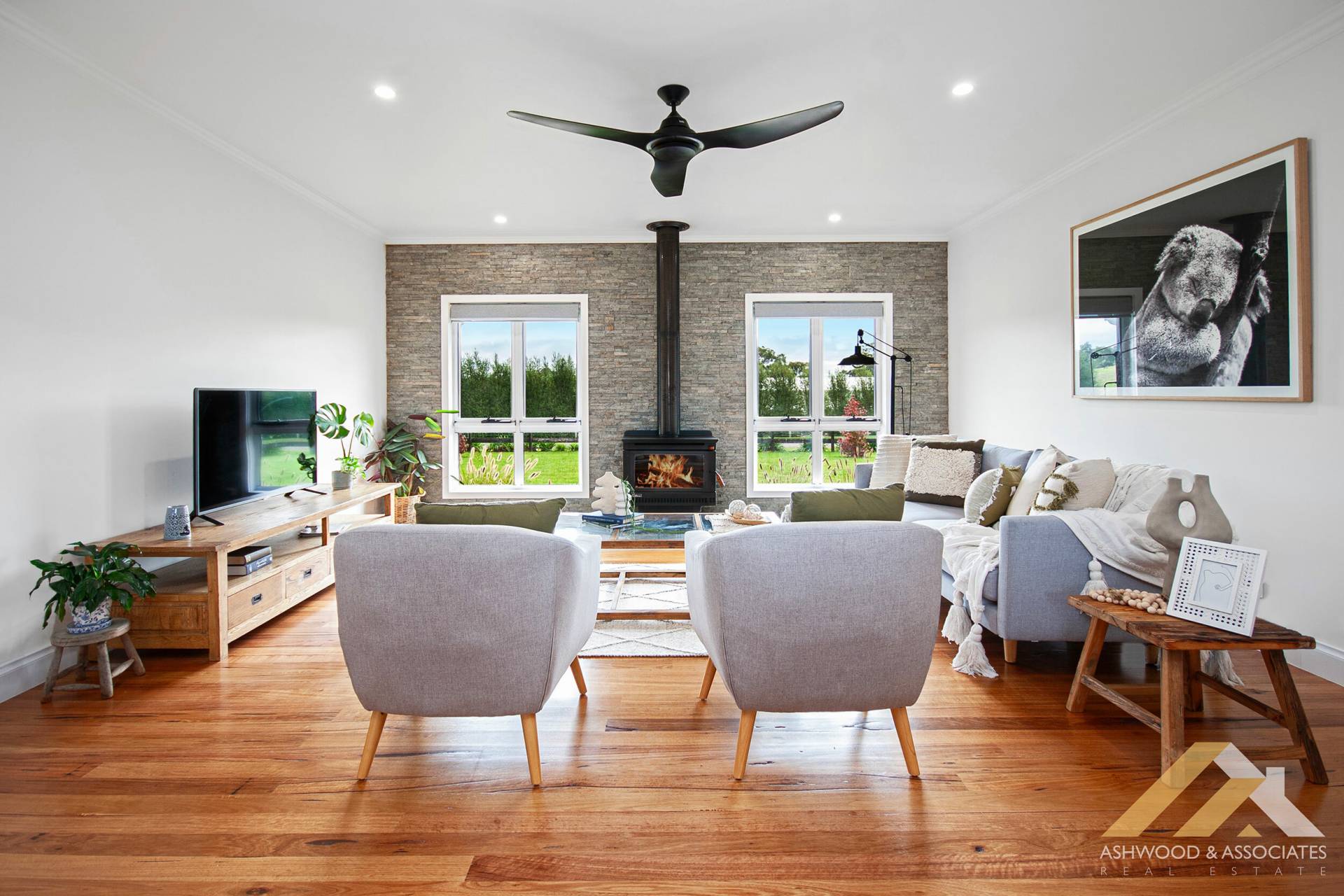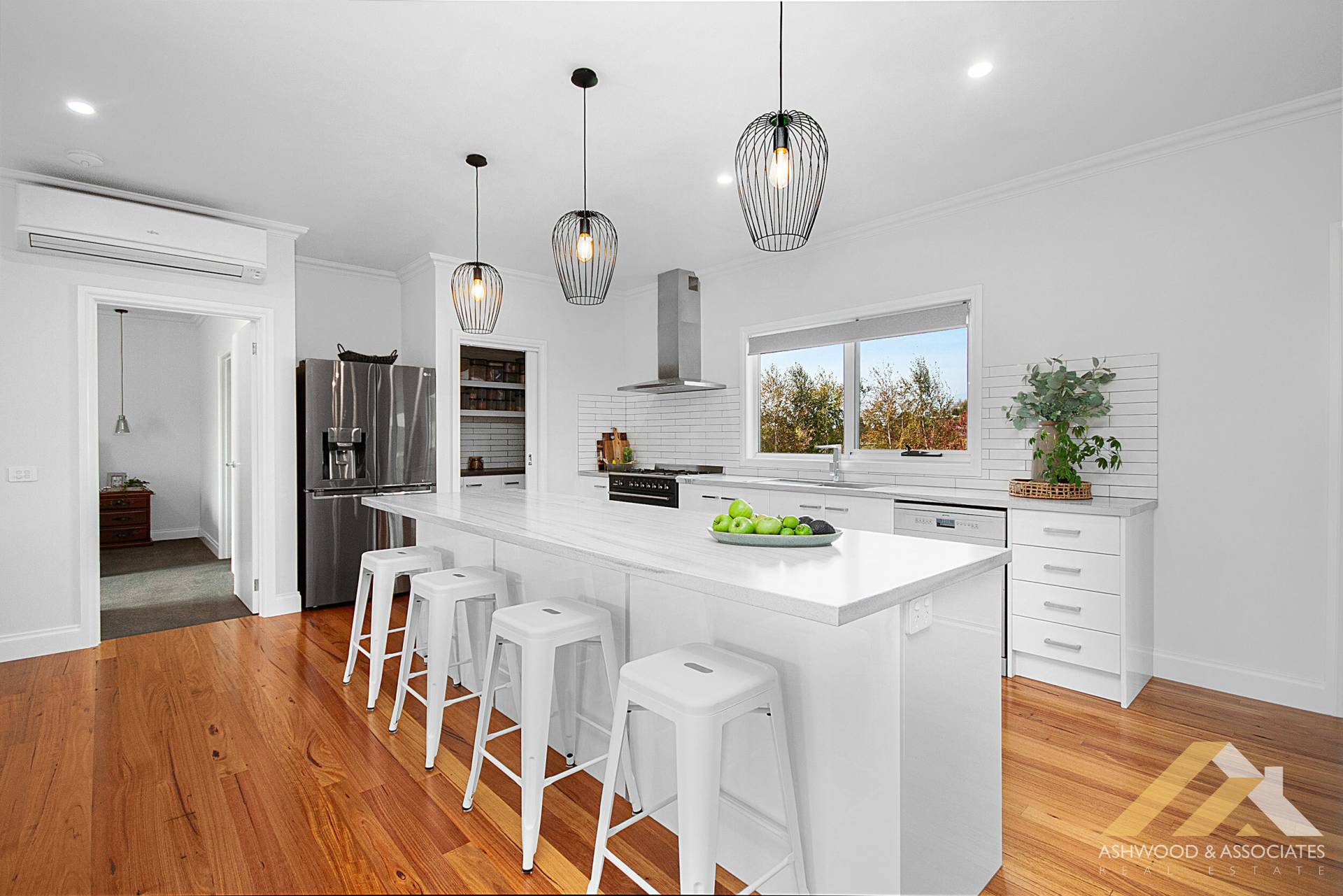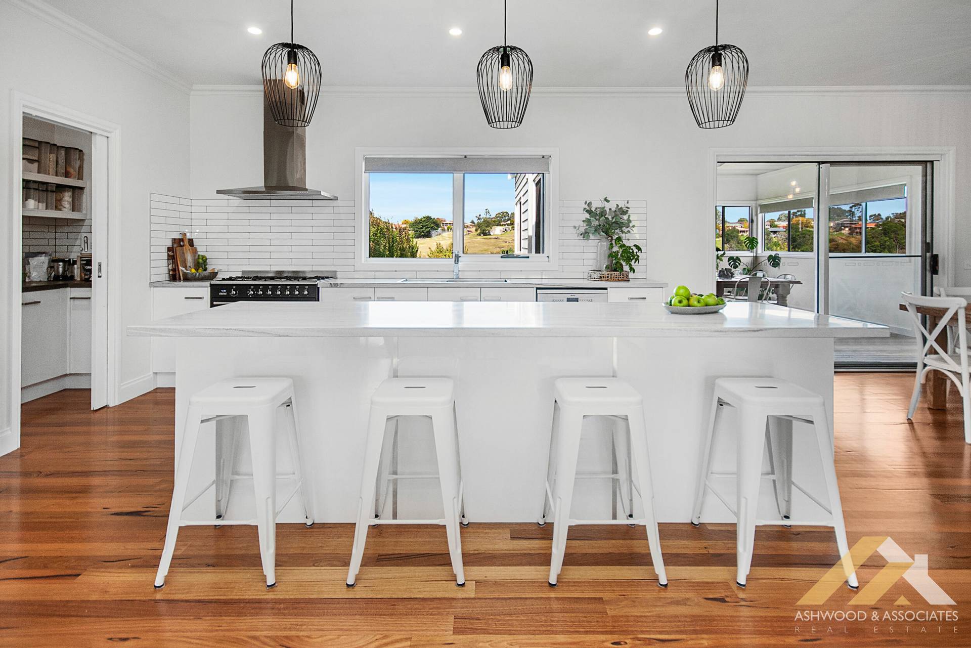 As you step inside this stunning home, you're greeted with an impressive sense of space, accentuated by the 2700mm high ceilings and solid timber floors throughout. The heart of the home is the spacious open-plan kitchen, living, and dining room, with the living area featuring a cosy wood fire that adds a touch of winter ambiance. The kitchen boasts sprawling stone look benches, an abundance of storage, and quality Smeg appliances, seamlessly flowing into a large pantry.