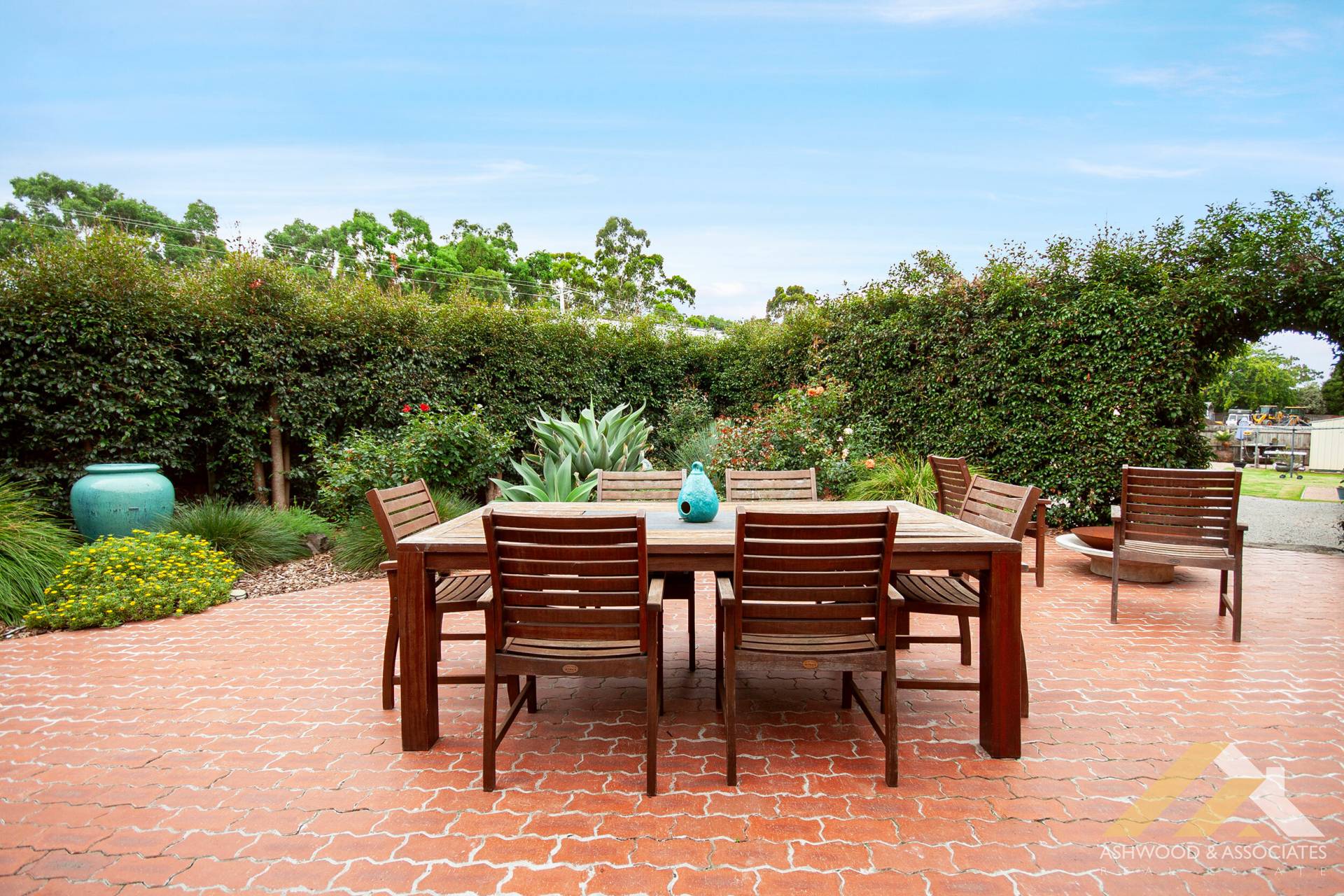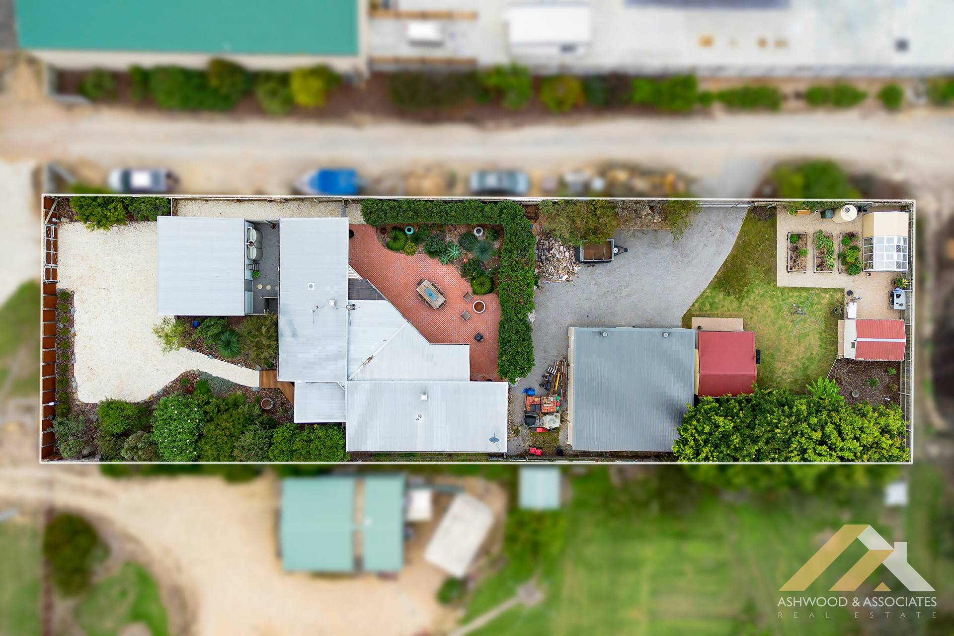 The property offers ample storage solutions, including a large shed/garage with dual high roller doors at the front, additional sheds with drive-through access, and a handy greenhouse and water tank for the green-thumbed. Outside, the paved courtyard area, embraced by tall hedging, presents a private enclave perfect for leisure or entertaining.