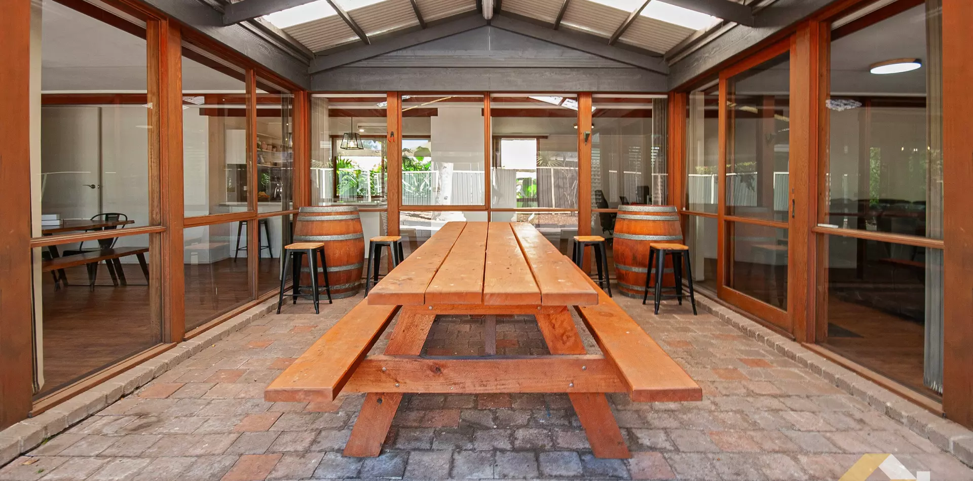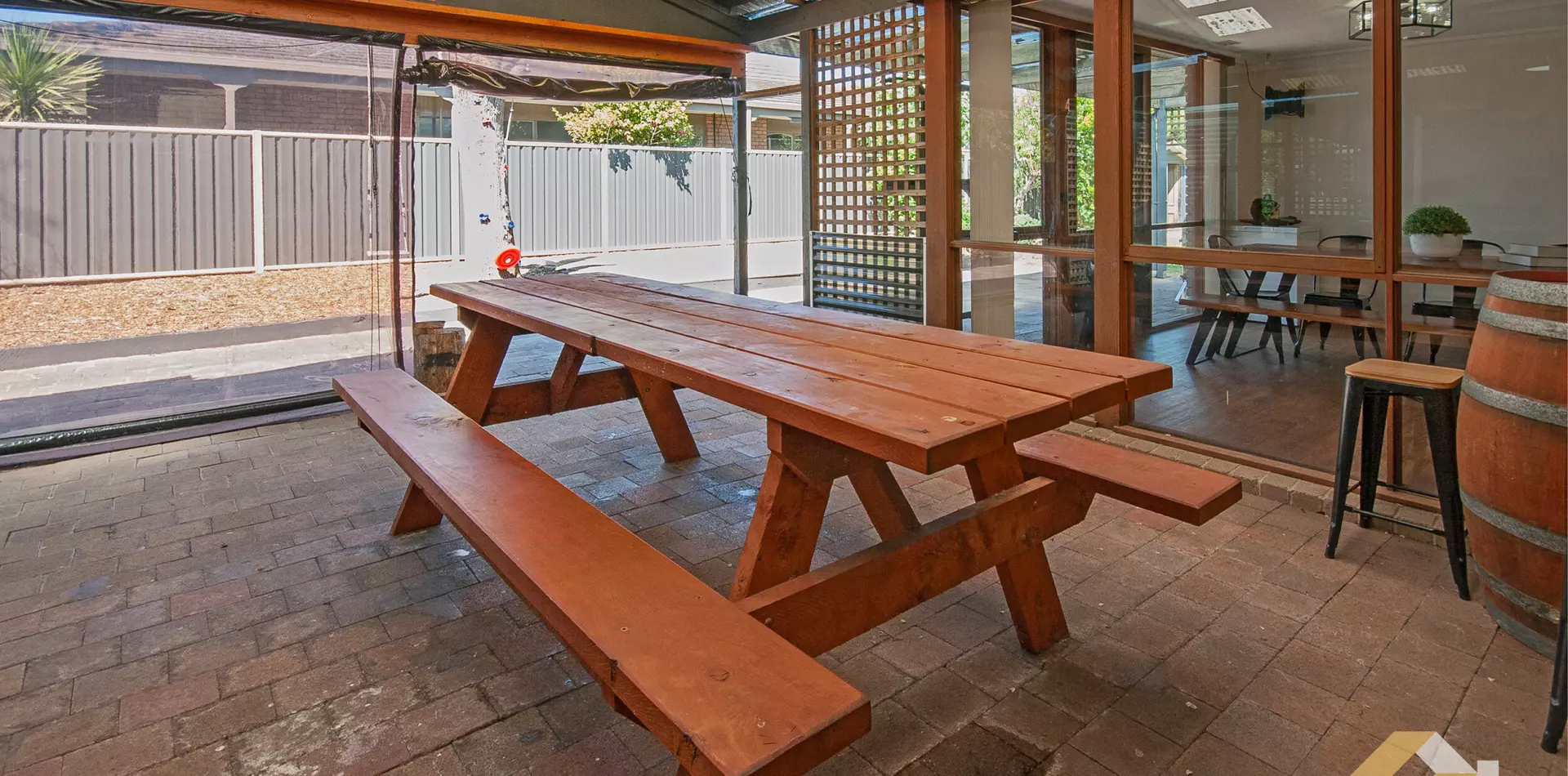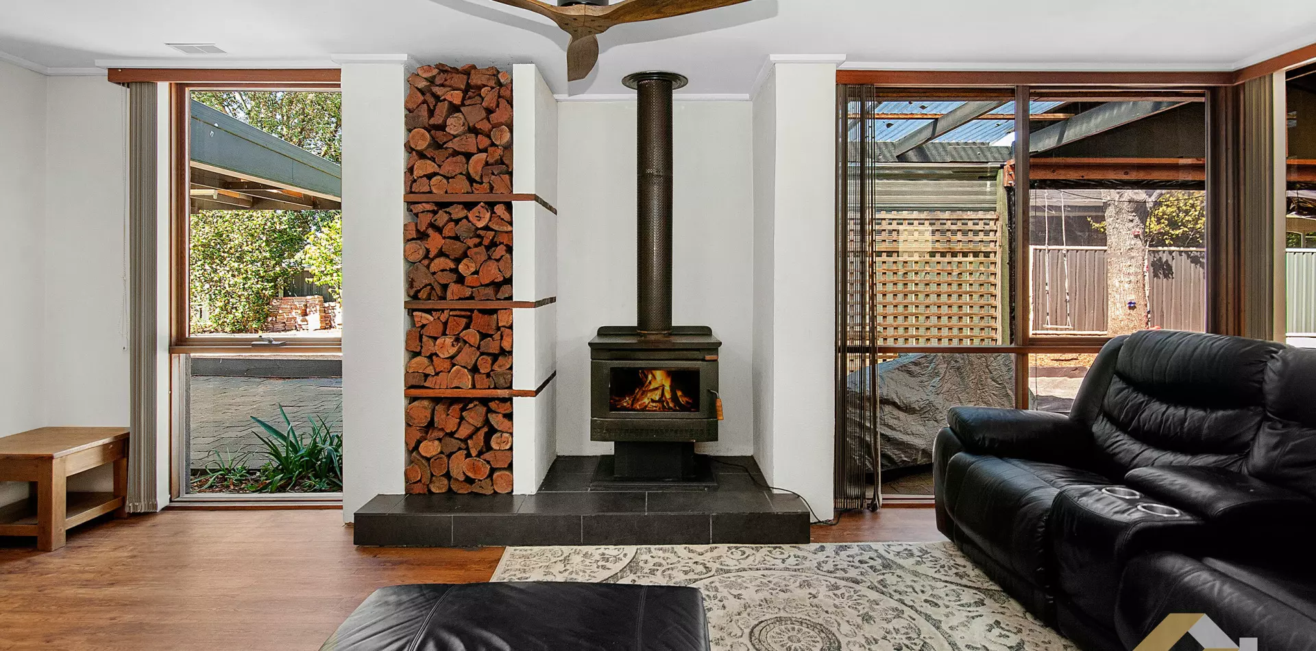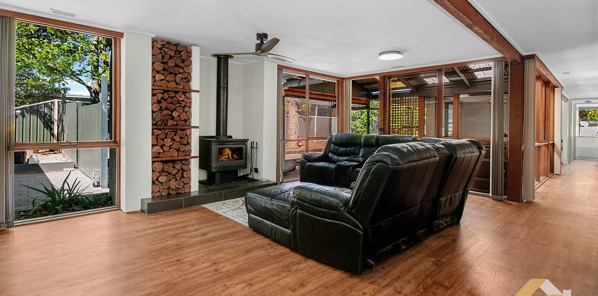 The flexible floorplan provides multiple living zones, including a generous main lounge with exposed beams, complete with a wood heater for cosy winter nights, and split-system heating and cooling for year-round comfort.