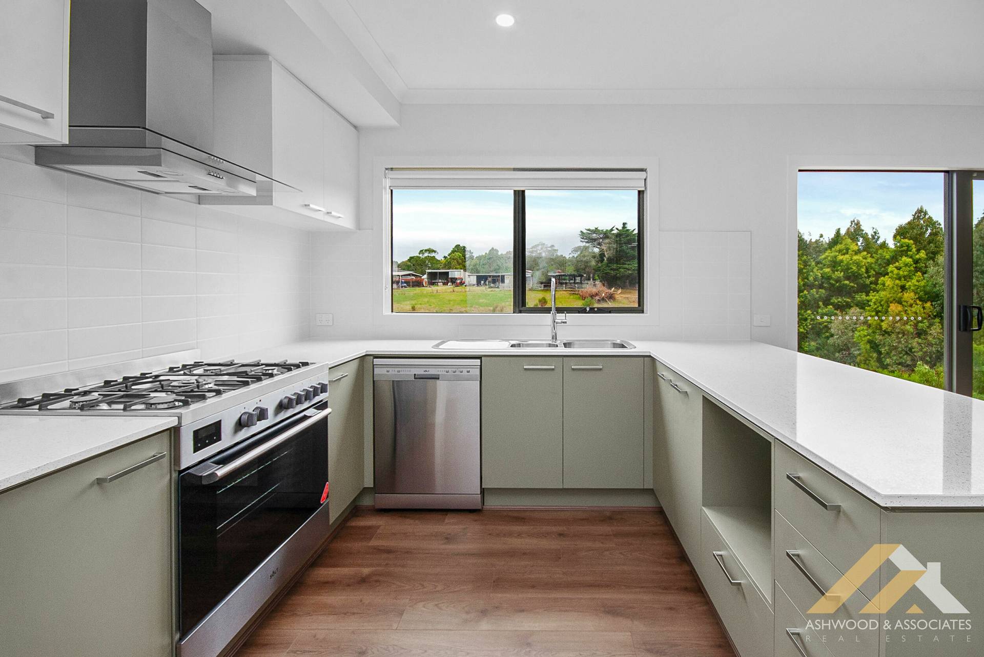The interiors are finished with stone benchtops and vanity tops, complemented by roller blinds throughout and high doors and ceilings.