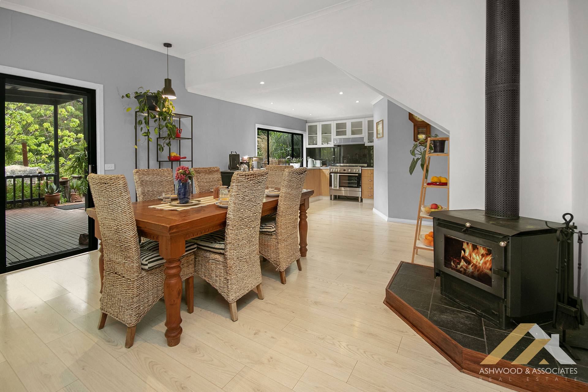 Upstairs, natural light fills a spacious second living area that opens onto a private verandah and leafy outlooks. Two additional bedrooms and a second bathroom provide comfortable accommodation, while a second woodfire and split system ensure year-round comfort.